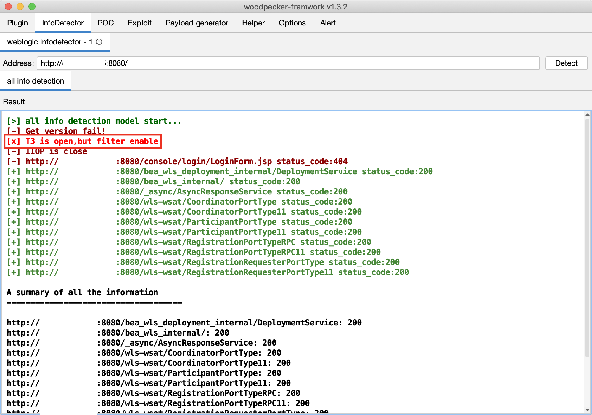 这些信息有什么用呢?当然是让我们知道面前这个weblogic的薄弱点在哪里,后续攻击的计划应该是:t3和iiop系列漏洞不用测试了,wls-wsat组件的xmldecoder漏洞可以看看。